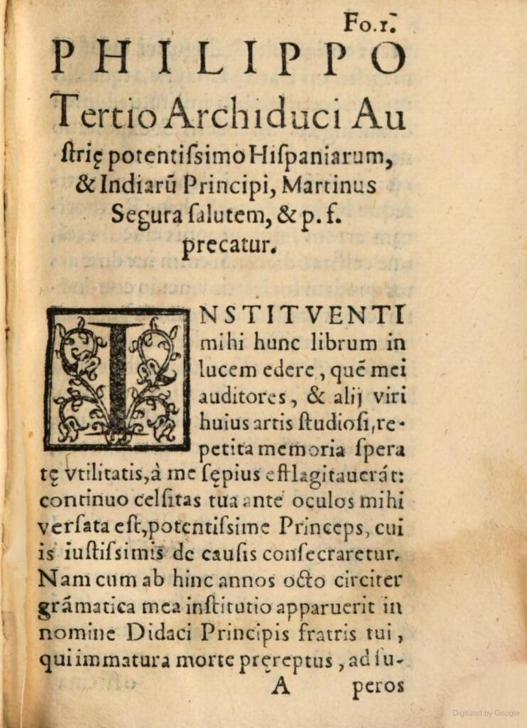 Nota: 1 Se ha desarrollado la abreviatura «p.f.» conforme a la carta dedicatoria al príncipe Diego de Austria de la Grammatica Institutio (1580: f. A[1]r) de Segura, donde empleó esta misma fórmula de salutatio (salvo por la ausencia de «et Indiarum») con la forma «perpetuam foelicitatem» en lugar de la abreviada.