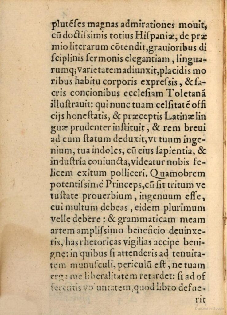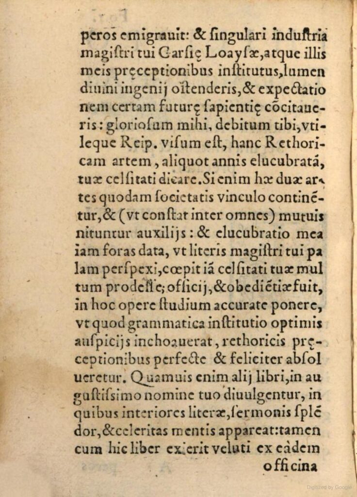 Instituenti mihi hunc librum in lucem edere, quem mei auditores et alii uiri huius artis studiosi, repetita memoria speratae utilitatis, a me saepius efflagitauerant, continuo celsitas tua ante oculos mihi uersata est, potentissime Princeps, cui is iustissimis de causis consecraretur. Nam cum ab hinc annos octo circiter Grammatica mea institutio apparuerit in nomine Didaci Principis fratris tui, qui immatura morte praereptus ad superos [f. 1v] emigrauit, et singulari industria magistri tui Garsiae Loaysae atque illis meis praeceptionibus institutus lumen diuini ingenii ostenderis et expectationem certam futurae sapientiae concitaueris, gloriosum mihi, debitum tibi utileque reipublicae uisum est hanc rhetoricam artem, aliquot annis elucubratam, tuae celsitati dicare. Si enim hae duae artes quodam societatis uinculo continentur et (ut constat inter omnes) mutuis nituntur auxiliis et elucubratio mea iam foras data, ut literis magistri tui palam perspexi, coepit iam celsitati tuae multum prodesse, officii et obedientiae fuit in hoc opere studium accurate ponere, ut quod Grammatica institutio optimis auspiciis inchoauerat, rhetoricis praeceptionibus perfecte et feliciter absolueretur.