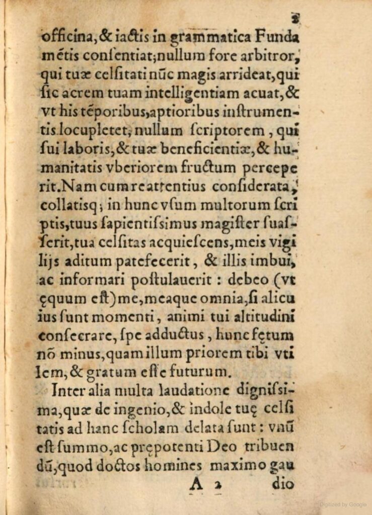 Quamuis enim alii libri in augustissimo nomine tuo diuulgentur, in quibus interiores literae, sermonis splendor et celeritas mentis appareat, tamen cum hic liber exierit ueluti ex eadem [f. 2r] officina et iactis in grammatica fundamentis consentiat, nullum fore arbitror, qui tuae celsitati nunc magis arrideat, qui sic acrem tuam intelligentiam acuat et, ut his temporibus, aptioribus instrumentis locupletet, nullum scriptorem, qui sui laboris et tuae beneficentiae et humanitatis uberiorem fructum perceperit. Nam cum, re attentius considerata collatisque in hunc usum multorum scriptis, tuus sapientissimus magister suasserit, tua celsitas acquiescens, meis uigiliis aditum patefecerit et illis imbui ac informari postulauerit, debeo (ut aequum est) me meaque omnia, si alicuius sunt momenti, animi tui altitudini consecrare, spe adductus hunc fetum non minus quam illum priorem tibi utilem et gratum esse futurum.