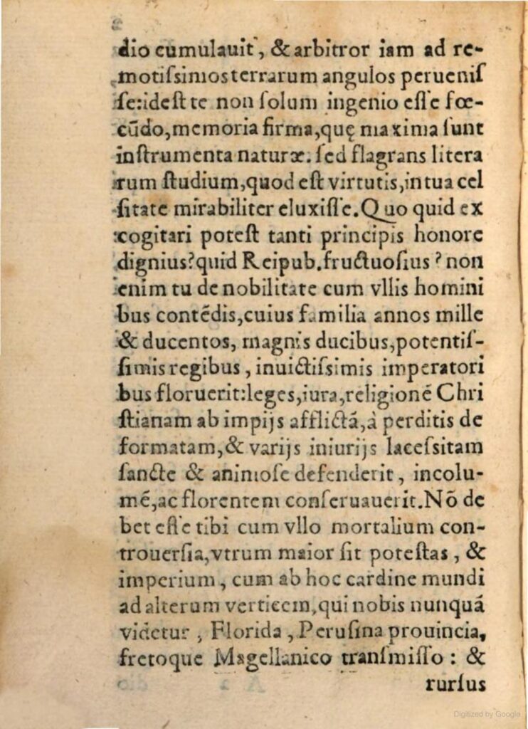 Inter alia multa laudatione dignissima, quae de ingenio et indole tuae celsitatis ad hanc scholam delata sunt, unum est summo ac praepotenti Deo tribuendum, quod doctos homines maximo gaudio [f. 2v] cumulauit et arbitror iam ad remotissimos terrarum angulos peruenisse, id est, te non solum ingenio esse foecundo, memoria firma, quae maxima sunt instrumenta naturae, sed flagrans literarum studium, quod est uirtutis, in tua celsitate mirabiliter eluxisse. Quo quid excogitari potest tanti principis honore dignius? quid reipublicae fructuosius? non enim tu de nobilitate cum ullis hominibus contendis, cuius familia annos mille et ducentos magnis ducibus, potentissimis regibus, inuictissimis imperatoribus floruerit, leges, iura, religionem christianam ab impiis afflictam, a perditis deformatam et uariis iniuriis lacessitam sancte et animose defenderit, incolumem ac florentem conseruauerit. Non debet esse tibi cum ullo mortalium controuersia utrum maior sit potestas et imperium, cum ab hoc cardine mundi ad alterum uerticem, qui nobis nunquam uidetur −Florida, Perusina prouincia fretoque Magellanico transmisso, [f. 3r] et rursus ab Vlissipone, Capite Bonaespei, Indico Malacensique pelago superato, ad Sinarum late patentem regionem et ad Iaponos incolas terrarum ultimarum−, tuis insulis, tuis portubus possis nauigare et ex classe in maritima loca et bonam partem continentis, tanquam in legitimam et tibi subiectam possessionem descendere et sine iniuria habitatorum a nauigationis labore et satietate conquiescere. Neque esse debet tibi certamen cum potentissimis regibus utri sint maiores opes, cum praeter alia multa ex Indico mari terraeque uenis, infinita uis margaritarum, auri et argenti eruta tibi seruiat quotannisque in Hispaniam a tuis praefectis importetur, qua non unus aut alter, sed innumerabiles aluntur exercitus, ornantur inuictissimae classes, quae nobis otium, hostibus interitum certum sunt allaturae. Hic est nouus orbis, quo non penetrauerunt arma Alexandri Magni, quamuis iactaret se imperio omnium terrarum esse potitum; [f. 3v] hunc non olfecit populus neque Imperatores Romani, qui alias nationes factis et ambitione uicerunt.