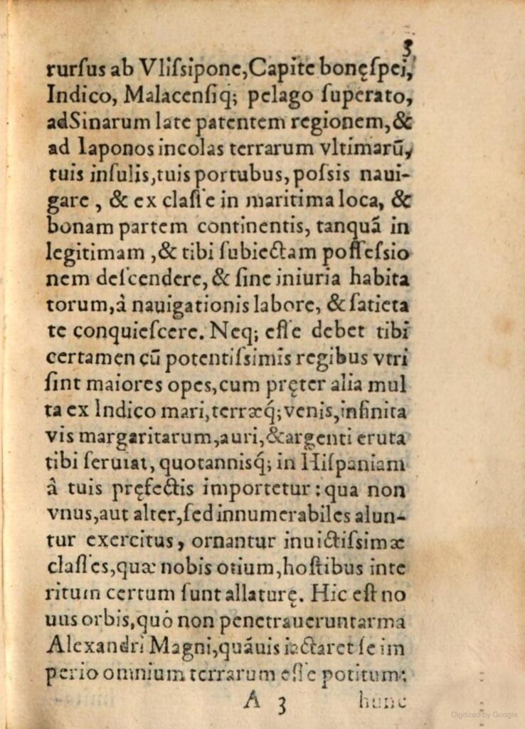 Inter alia multa laudatione dignissima, quae de ingenio et indole tuae celsitatis ad hanc scholam delata sunt, unum est summo ac praepotenti Deo tribuendum, quod doctos homines maximo gaudio [f. 2v] cumulauit et arbitror iam ad remotissimos terrarum angulos peruenisse, id est, te non solum ingenio esse foecundo, memoria firma, quae maxima sunt instrumenta naturae, sed flagrans literarum studium, quod est uirtutis, in tua celsitate mirabiliter eluxisse. Quo quid excogitari potest tanti principis honore dignius? quid reipublicae fructuosius? non enim tu de nobilitate cum ullis hominibus contendis, cuius familia annos mille et ducentos magnis ducibus, potentissimis regibus, inuictissimis imperatoribus floruerit, leges, iura, religionem christianam ab impiis afflictam, a perditis deformatam et uariis iniuriis lacessitam sancte et animose defenderit, incolumem ac florentem conseruauerit. Non debet esse tibi cum ullo mortalium controuersia utrum maior sit potestas et imperium, cum ab hoc cardine mundi ad alterum uerticem, qui nobis nunquam uidetur −Florida, Perusina prouincia fretoque Magellanico transmisso, [f. 3r] et rursus ab Vlissipone, Capite Bonaespei, Indico Malacensique pelago Sinarum late patentem regionem et ad Iaponos incolas terrarum ultimarum−, tuis insulis, tuis portubus possis nauigare et ex classe in maritima loca et bonam partem continentis, tanquam in legitimam et tibi subiectam possessionem descendere et sine iniuria habitatorum a nauigationis labore et satietate conquiescere. Neque esse debet tibi certamen cum potentissimis regibus utri sint maiores opes, cum praeter alia multa ex Indico mari terraeque uenis, infinita uis margaritarum, auri et argenti eruta tibi seruiat quotannisque in Hispaniam a tuis praefectis importetur, qua non unus aut alter, sed innumerabiles aluntur exercitus, ornantur inuictissimae classes, quae nobis otium, hostibus interitum certum sunt allaturae. Hic est nouus orbis, quo non penetrauerunt arma Alexandri Magni, quamuis iactaret se imperio omnium terrarum esse potitum; [f. 3v] hunc non olfecit populus neque Imperatores Romani, qui alias nationes factis et ambitione uicerunt.