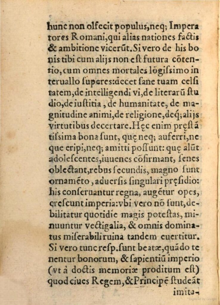 Si uero de his bonis tibi cum aliis non est futura contentio, cum omnes mortales longissimo interuallo superes, decet sane tuam celsitatem de intelligendi ui, de literarum studio, de iustitia, de humanitate, de magnitudine animi, de religione deque aliis uirtutibus decertare. Haec enim praestantissima bona sunt, quae neque auferri neque eripi neque amitti possunt, quae alunt adolescentes, iuuenes confirmant, senes oblectant; rebus secundis magno sunt ornamento, aduersis singulari praesidio; his conseruantur regna, augentur opes, crescunt imperia. Vbi uero non sunt, debilitatur quotidie magis potestas, minuuntur uectigalia et omnis dominatus miserabili ruina tandem euertitur. Si uero tunc respublicae sunt beatae, quando tenentur bonorum et sapientium imperio (ut a doctis memoriae proditum est), quod ciues regem et principem [f. 4r] studeant imitari, habere debemus pro certo nunc Hispanam rempublicam florentissimam esse, quae parentis tui, post Salomonem sapientissimi, consilio administretur, quae te Principem, ut hac aetate cinctum maximo comitatu uirtutum legitimumque haeredem tot tantorumque regnorum agnoscat, suspiciat et uitam diuturnam ualetudinemque integram assidue tibi precetur. Huius praeclari operis et publicae felicitatis, summus architectus est pater tuus, qui, ut negotio maximi ponderis, praeest diligenter tuae institutioni.