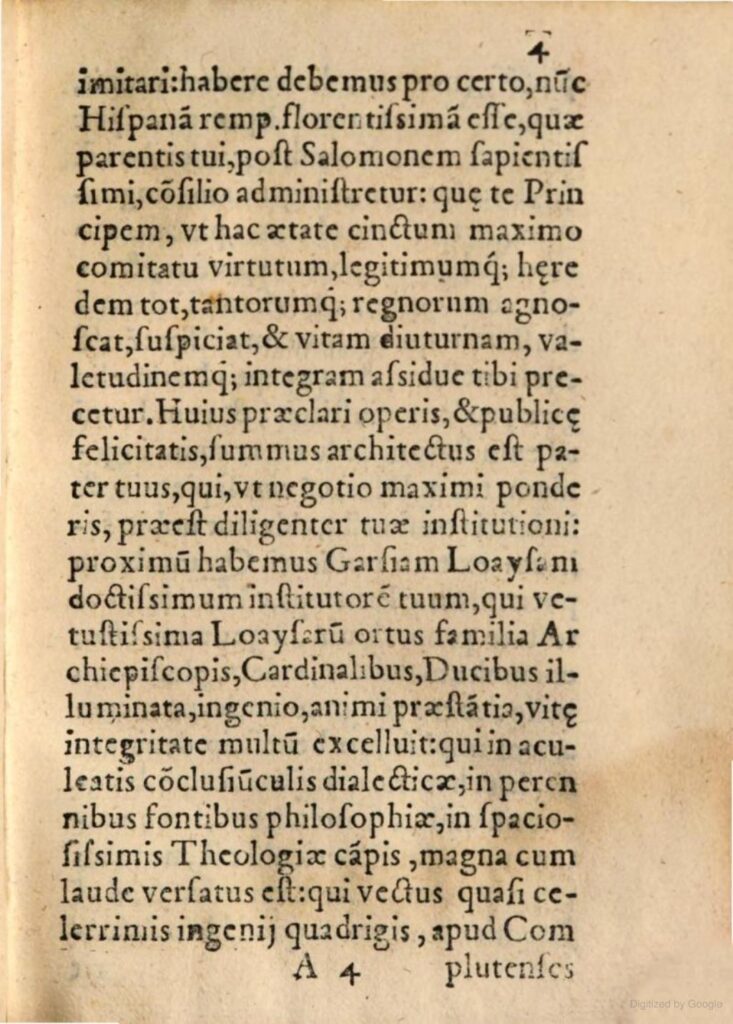Proximum habemus Garsiam Loaysam, doctissimum institutiorem tuum, qui uetustissima Loaysarum ortus familia archiepiscopis, cardinalibus, ducibus illuminata, ingenio, animi praestantia, uitae integritate multum excelluit, qui in aculeatis conclusiunculis dialecticae, in perennibus fontibus philosophiae, in spaciosissimis Theologiae campis, magna cum laude uersatus est; qui uectus quasi celerrimis ingenii quadrigis apud Complutenses [f. 4v] magnas admirationes mouit, cum doctissimis totius Hispaniae de praemio literarum contendit, grauioribus disciplinis sermonis elegantiam linguarumque uarietatem adiunxit, placidis moribus habitu corporis expressis et sacris concionibus ecclesiam Toletanam illustrauit; qui nunc tuam celsitatem officiis honestatis et praeceptis Latinae linguae prudenter instituit et rem breui ad eum statum deduxit, ut tuum ingenium, tua indoles cum eius sapientia et industria coniuncta uideatur nobis felicem exitum polliceri.