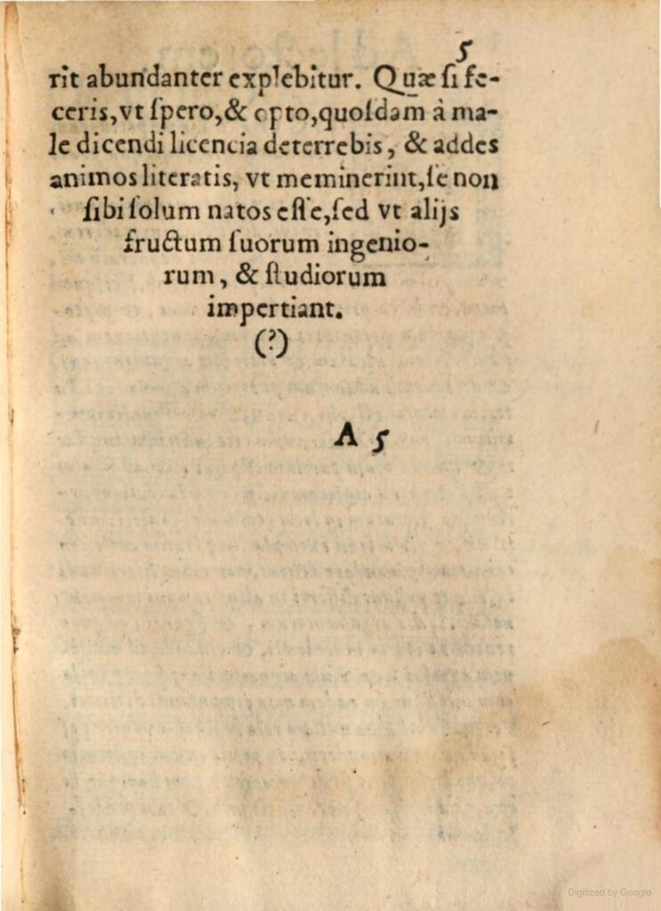 Quamobrem, potentissime Princeps, cum sit tritum uetustate prouerbium «ingenuum esse, cui multum debeas, eidem plurimum uelle debere» et grammaticam meam artem amplissimo beneficio deuinxeris, has rhetoricas uigilias accipe benigne, in quibus si attenderis ad tenuitatem munusculi, periculum est ne tuam erga me liberalitatem retardet; si ad offerentis uoluntatem, quod libro [f. 5r] defuerit abundanter explebitur. Quae si feceris, ut spero et opto, quosdam a male dicendi licencia deterrebis et addes animos literatis, ut meminerint se non sibi solum natos esse, sed ut aliis fructum suorum ingeniorum et studiorum impertiant.